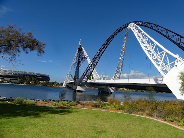 With a little sand in our shoes, we headed for the GameField by the Optus Stadium for a pizza. After pizza and beer, we walked across the Matagarup pedestrian bridge that spans the Swan River. This is all new to us to Perth as well the stadium dating from 2017 and the bridge 2018.